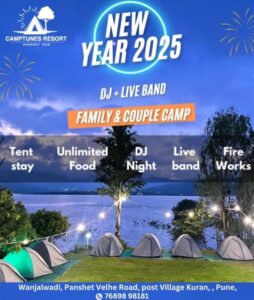 New Year Camping Party & Celebrations 2025 at Camptunes resort panshet our isolated and amidst campsite into the lap of nature near Khadakwasla (Approx. 2.5/1 Hrs. drive from Mumbai & Pune)
