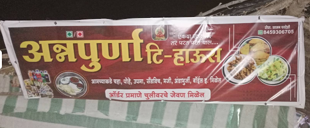 This banner advertises a place called Annapurna Tea-House. It highlights their menu items, including snacks like poha and bhaji, and promises that meals cooked on a traditional wood-fired stove (chul) are available upon request. The text is in Marathi.