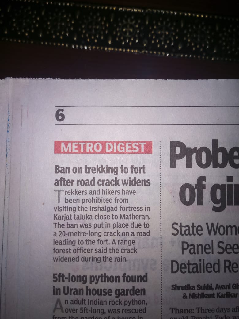 Trekkers and hikers have been prohibited from visting the irshalgad fortress at karjat taluka close to matheran.This ban was put in place due to a 20 mtr long crack in the road leading to the fort. A range forest officer said the crack widened during the rain