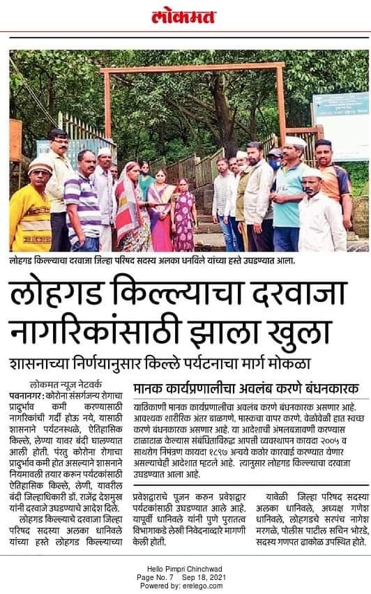 लोहगड किल्ला आज पासुन पर्यटकांसाठी चालु करण्यात आला आहे