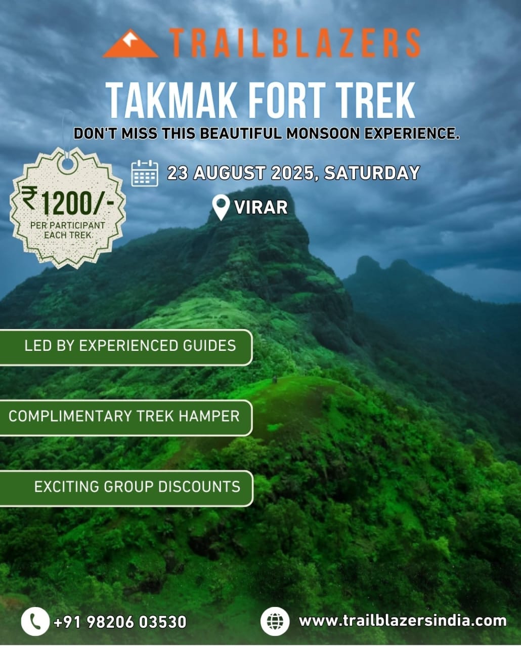 1 » Mumbai Pune trek list 2025 » #mumbai #pune treks and trips 22nd to 25th August 2025 – 17 August 2025 » trailblazers takmak fort trek 23rd augtrailblazers takmak fort trek 23rd augby mumbai hikersAugust 17, 2025 trailblazers takmak fort trek 23rd aug Leave a Reply Cancel replyYour email address will not be published. Required fields are marked *Name * Email * Website Comment * Save my name, email, and website in this browser for the next time I comment. Δ This site uses Akismet to reduce spam. Learn how your comment data is processed.