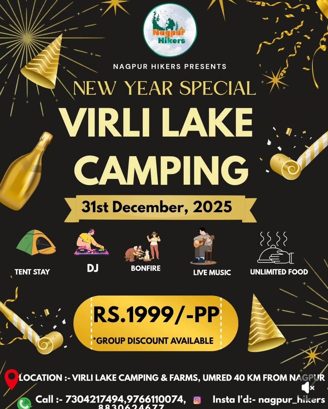 1 » New Year Camping 2026 » New year 2026 camping around Maharashtra India – 31st December 2025 » nagpur hikers virili lake camping 31st decnagpur hikers virili lake camping 31st decby mumbai hikersDecember 11, 2025 nagpur hikers virili lake camping 31st dec Leave a Reply Cancel replyYour email address will not be published. Required fields are marked *Name * Email * Website Comment * Save my name, email, and website in this browser for the next time I comment. Δ This site uses Akismet to reduce spam. Learn how your comment data is processed.