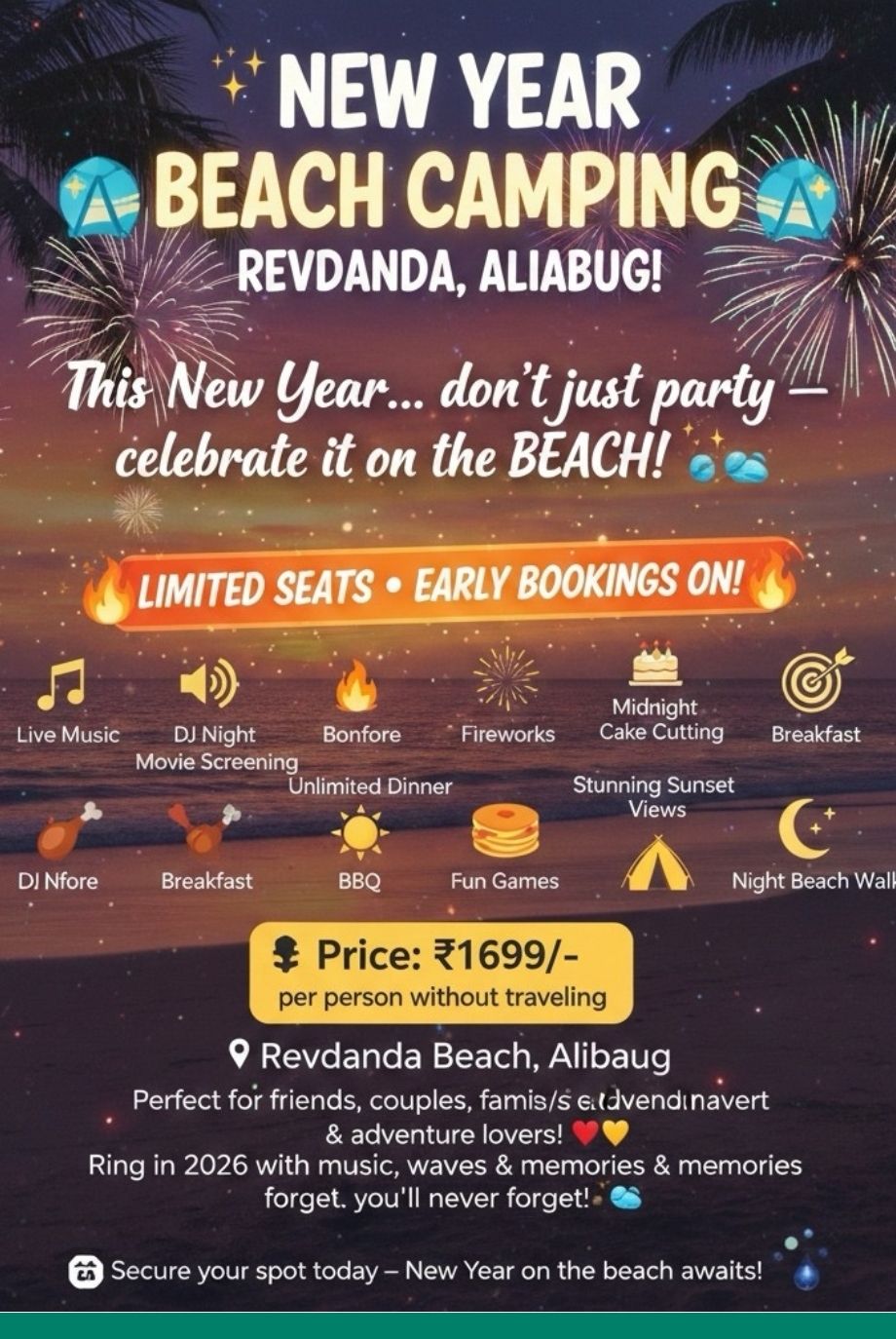 1 » New Year Camping 2026 » New year 2026 camping around Maharashtra India – 31st December 2025 » revdanda alibaug beach campingrevdanda alibaug beach campingby mumbai hikersDecember 11, 2025 revdanda alibaug beach camping Leave a Reply Cancel replyYour email address will not be published. Required fields are marked *Name * Email * Website Comment * Save my name, email, and website in this browser for the next time I comment. Δ This site uses Akismet to reduce spam. Learn how your comment data is processed.