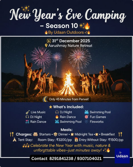 1 » New Year Camping 2026 » New year 2026 camping around Maharashtra India – 31st December 2025 » udaan outdoors new year campingudaan outdoors new year campingby mumbai hikersDecember 11, 2025 udaan outdoors new year camping Leave a Reply Cancel replyYour email address will not be published. Required fields are marked *Name * Email * Website Comment * Save my name, email, and website in this browser for the next time I comment. Δ This site uses Akismet to reduce spam. Learn how your comment data is processed.