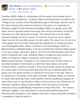 Nitin Bande Sandhan Valley TrekSandhan Valley, also known as Valley of suspense or Valley of Shadow, is one of the greatest canyons in the splendid setting of Sahyadri (Western Ghats). The water carved valley is 200 ft deep and about 1.5km long. Sandhan valley is located on the western side of the beautiful Bhandardara region, near Samrad village. The valley is surrounded with mighty Alang, Madan and Kulang (Known as AMK- rated as the toughest trek in Sahyadri) Ratangad, Ajoba & Kalsubai (5400 ft. highest peak in Maharashtra) mountain ranges. The brilliant and deep narrow rock floored ravine is located between the two high walls of mountain range. At some places its width is less than 3 ft and at some places sun rays unable to reach the ground. Which gives it the name: valley of shadows.Region: IgatpuriContribution: Rs 900 /-(rappeling, two breakfast, onedinner, one lunch)Assembly: Kasara railway stationDuration: 1 day one nightTrek Leader/expert : Nitin Bande ItineraryBoard Kasara slow local from Mumbai CST on Friday. Train timing as below:22:50 CST23.04 Dadar23:31 Thane00.03 Kalyan01:18 KasaraPune Participants:Board Indrayani train from Pune at 18:35Reach Kalyan 21:00 (have dinner before you board the train)Board local train till Kasara.Day: – Saturday 31 december 201601:30 Assemble at Kasara Rail Station05:30 Reach base village by local transport06:30 Breakfast.07:00 Start full descend trek towards Sandhan Valley13:30 Lunch in route.20:30 Dinner & night stay in tentDay: 2 – Sunday06:30 Wake up, Breakfaststart journey to return base village samradFor Registration and Confirmation transfer Rs. 900.00 per person in the given a/c Participant Name, email ID, mobile phone number, emergency contact number.For any queries please call or whatsapp Nitin Bande(8805405671)