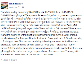 Sandhan valley campping SANDHAN VALLEY GUIDE & SERVICES SAMRADसह्याद्रीगाईड सर्व्हिसेस,आमच्या येथे सांधणव्हॅली,करोली घाट,अलंग-मदन-कुलंग,रतनगड इत्यादी ठिकाणी जाण्यासाठी प्रशिक्षित व अनुभवी गाईड्सची व्यवस्था योग्य दरात केली जाईल. तसेच आमच्या भागात येणा-या ट्रेकर्ससाठी उत्कृष्ट व घरगुती चवीचे चहा-नाष्टा,व्हेज व नॉनव्हेज अमर्यादित जेवण, निवास व्यवस्था,टेंट सुविधा तसेच कॅम्पिंग सेवा उपलब्ध करून दिली जाईल.रॅपलिंग,व्हॅली क्रॉसिंग,रॉक क्लाइंबिंग इत्यादी साहसी खेळांसाठी योग्य मार्गदर्शन व टेक्निकल सपोर्ट मिळेल.रतनगड-कळसूबाई येथे खास पावसाळी ट्रेक्ससाठी जाणकार गाईड्स मिळतील.1. Sandhan valley.2. Sandhan valley to karoli ghat return (rappelling included).3. AMK (alang-madan-kulang) trek (rappelling including).4. Ratangad trek.5. Sandhan valley – Ratangad trek.Also we are providing following services for trekkers and groups.1. Tent or house on rent basis.2. Food (tea – breakfast – lunch – dinner ).3. Guide for fascinating surrounding area.Kindly contact us if you are planing for the treks or else yo required any of services here.Thanks, Nitin Bande MOB: 8805405671 (Whats Up — Sandhan