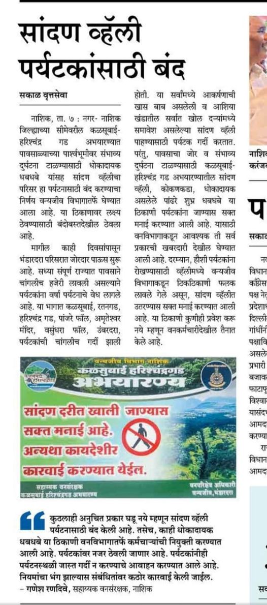“Sandan Valley has been closed for tourism to prevent any untoward incidents. Also, some dangerous waterfalls have been staffed by the forest department. Tourists will be monitored. Tourists are also urged not to overcrowd the tourist spot. Action will be taken. ” – Ganesh Ranadive, Assistant Forest Conservator, Nashik