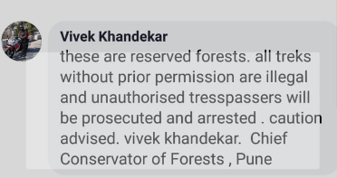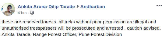 Andharban is a reserved forest under administrative control of forest department pune. and any unauthorised entry is considered as trespassing. Illegal entry will result in arrest, confiscation and prosecution. Caution advised.