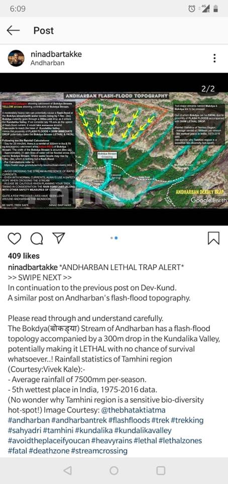 अंधारबन व देवकुंड परिसरात पावसाळ्यात असणारा धोका व तेथील सत्य परिस्थिती याची अभ्यासपूर्ण माहिती फोटोद्वारे श्री. Ninad Bartakke यांनी मांडली आहे. प्रत्येकाने भटकंतीपूर्वी अवश्य पहावी व आवश्यक ती काळजी घ्यावी.