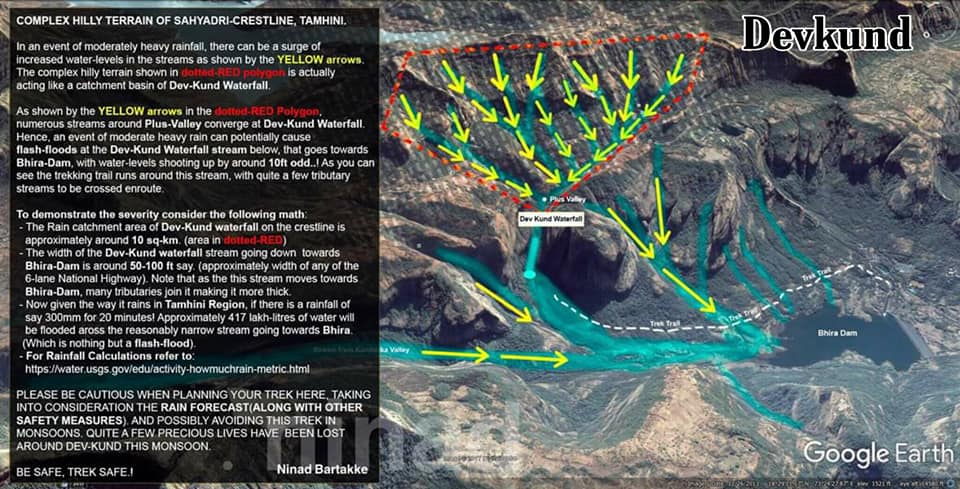 ताम्हिणी घाट, देवकुंड व अंधारबन परिसरातील होणाऱ्या अतिवृष्टीमुळे तिथल्या ओढ्यां-नाल्यांचा प्रवाह काही अवधीत धोकादायक पातळीवर पोहचतो व अचानक बदलेल्या परिस्थितीचा अंदाज सहजासहजी येतही नाही आणि अशा अचानक उद्भवलेल्या कठीण परिस्थितीला कसे सामोरे जावे याचे ज्ञान व अत्यावश्यक असणारी साधनसामुग्री नसल्यामुळे पर्यायी अनेक अपघात होतात, शिवाय काही जणांना तर जीवाशी मुकावे लागते (दरवर्षी हा आकडा वाढतच असतो). मग अशी जीवघेणी भटकंती कशाला हवे? व अशा अतिउत्साही पर्यटकांमुळे हा परिसरही हकनाक बदनाम होतो त्याचे काय?