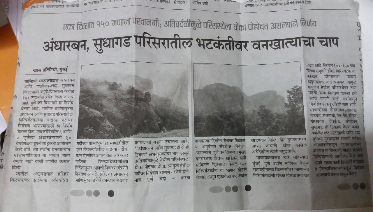 Only 150 people will be allowed in the daytime on the fort and near Sudhagad fort near Dahanini Ghat near the Tahani Ghat. The Pune forest department has taken this decision. This decision was taken last year to control the growing crowd of arrestees in Andheran and Sudhagad areas. However, even on July 6 and 7, 10 different groups of these treks were organized for drought. All of them will realize that the forest is not allowed in this area without the permission of the forest.